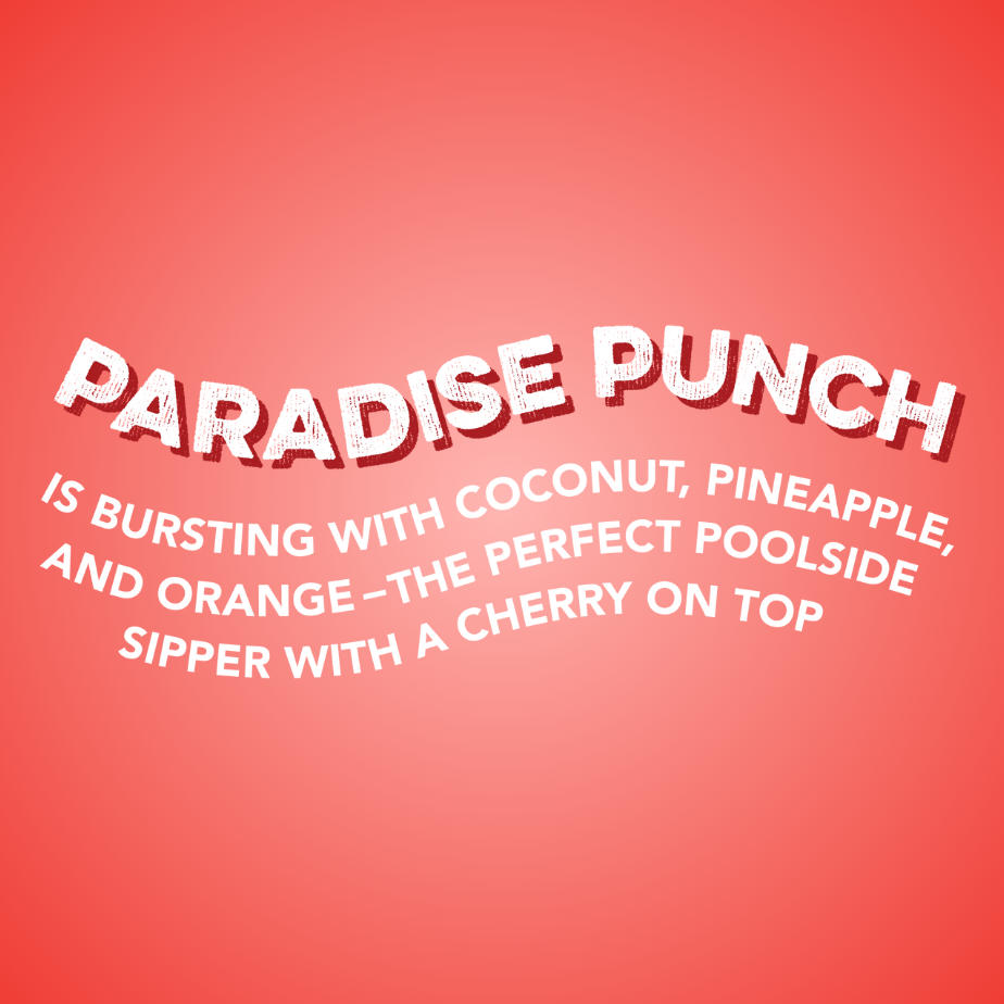 FLAVOR PROFILE: Paradise Punch is bursting with coconut. pineapple. and orange – the perfect poolside sipper with a cherry on top.
