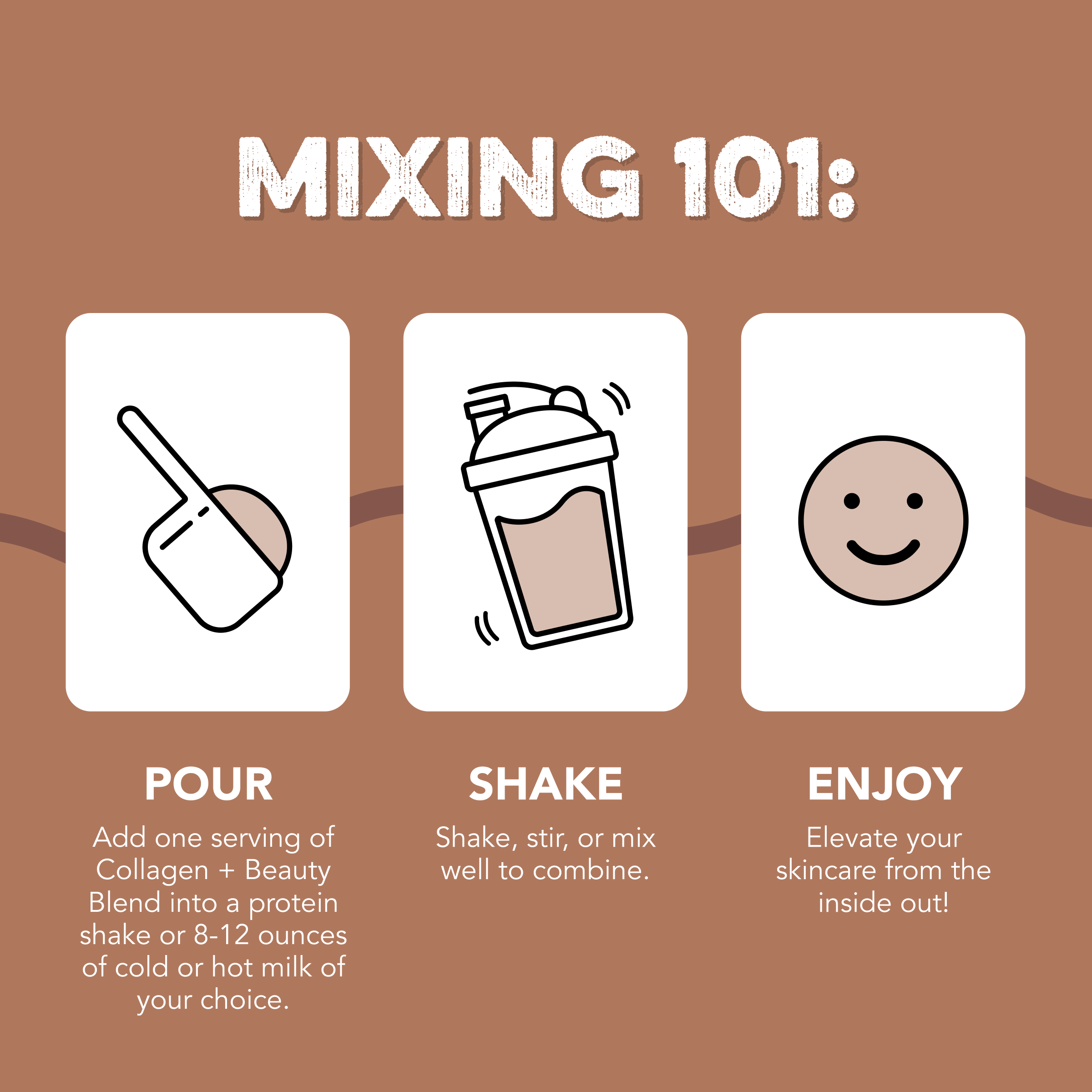 HOW TO USE: Add one serving of Collagen + Beauty Blend into a protein shake or 8-12 ounces of cold or hot milk of your choice. Mix well and enjoy!